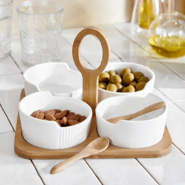 Чаши FINCAN изготовлены из высококачественного фарфора, а подставка, на которой они стоят, - из бамбука. . В центре доски расположена практичная ручка, которая позволяет удобно переносить ее вместе с содержимым, и в то же время красиво дополняет визуальный эффект.