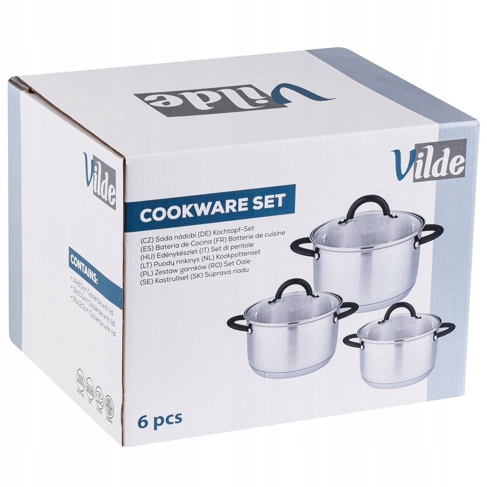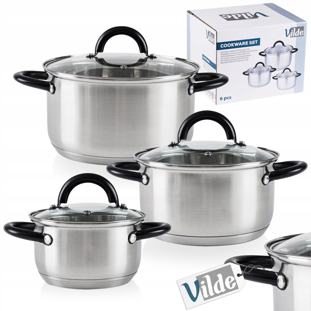 Набор посуды, состоящий из шести элементов. В комплект входят: кастрюля емкостью 1 л (общий полезный объем 1,2 л, диаметр 14 см, высота 9 см, высота с крышкой 14 см), кастрюля емкостью 2 л. (общая полезная емкость 2,3 л, диаметр 18 см, высота 10,5 см, высота с крышкой 16,5 см) и кастрюля емкостью 4 л (общая полезная емкость 4,2 л, диаметр 22 см) , высота 13 см, высота с крышкой 18,5 см). Посуда прекрасно подходит для варки, жарки и тушения, в ней можно готовить самые разные блюда. Набор кастрюль имеет элегантный внешний вид и чрезвычайно эффектно смотрится на кухне и при подаче блюд непосредственно на стол. Идеальная идея подарка для ваших близких. Оригинальный продукт Vilde. Произведен в соответствии с европейскими стандартами.