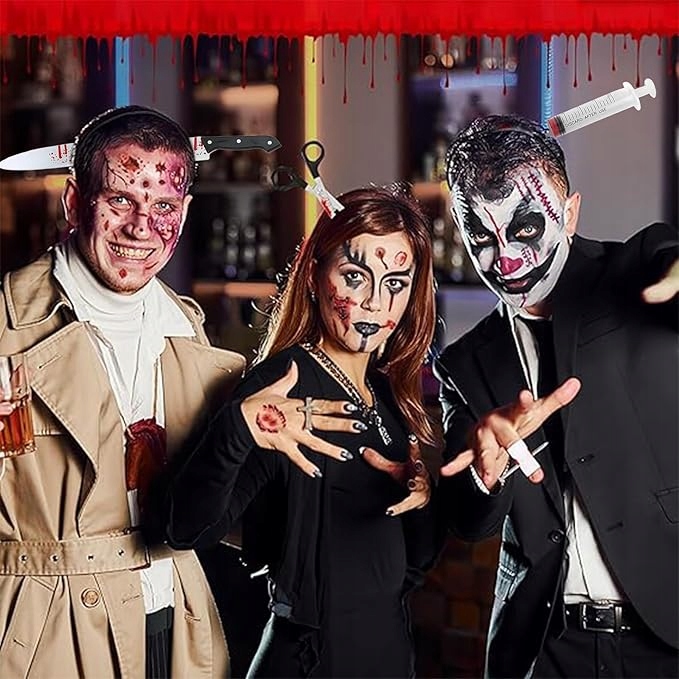 ✅ В наш набор на Хэллоуин входят три жутких головных убора: ножницы, пронзенные головой, шприц, проткнувший голову, и нож мясника. Дополнительно в набор входят 10 временных татуировок на тело, которые повышают реалистичность всей укладки.