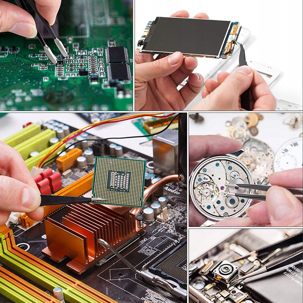 Набор прецизионных пинцетов – это изделие, идеально подходящее для работы с электроникой, например с телефонами или планшетами. Их универсальный характер допускает практически неограниченное применение. Они изготовлены из антимагнитного, антистатического, кислотостойкого и нержавеющего материала. Такое решение означает, что пинцеты не притягивают металлические элементы и остатки олова, что делает их идеальными для элементов, чувствительных к магнитным полям.