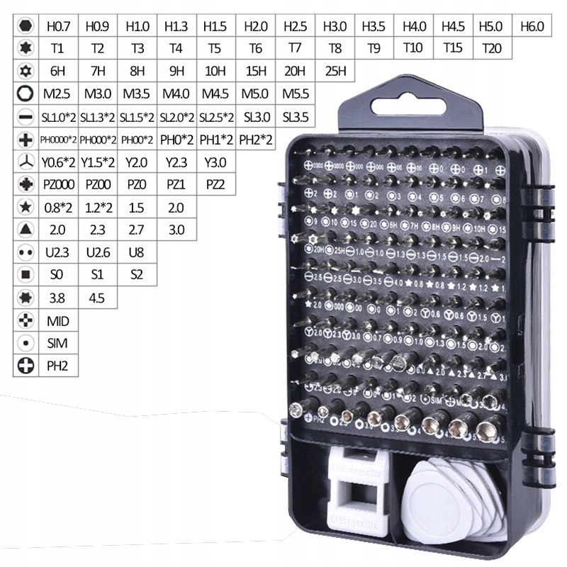 Обширный набор отверток + 110 различных бит для отвинчиваний, популярных в электронных устройствах.