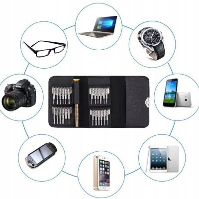 Пользователю предоставляются 24 отвертки, адаптированные для различных типов винтов разных размеров. Набор идеально подходит для ремонта небольших электронных устройств, таких как телефоны, планшеты или фотоаппараты, а также изделий, содержащих очень маленькие винты, таких как очки или часы. Чтобы заменить отвертки, просто вставьте их в отверстие в стержне — магнит внутри удержит наконечник на месте!