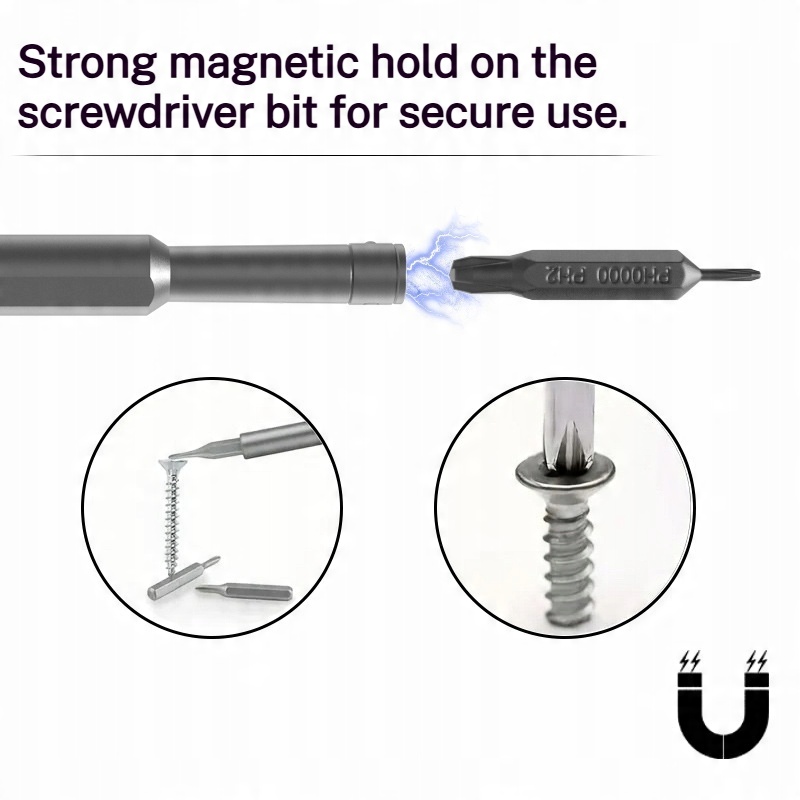 Полоса инструмента оборудована встроенным постоянным магнитом, который передает магнитную силу на головку инструмента битом отвертки, что позволяет легко поглощать винты без необходимости дополнительной намагниченности.