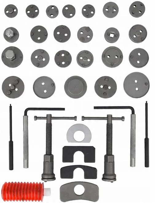 Профессиональный набор из 35 предметов для снятия/выдавливания поршней в цилиндрах тормозной системы, необходимый при ремонте автомобилей, оснащенных дисковыми тормозами. Устройство состоит из двух винтовых прессов – правостороннего и левостороннего действия и набора пластин, позволяющих производить замену поршней в широком диапазоне автомобилей. Ручка оснащена магнитным наконечником, благодаря которому удерживает на оси пластину, соответствующую данному поршню. Набор предназначен для каждой автомастерской, где он помогает ускорить обслуживание тормозных систем.