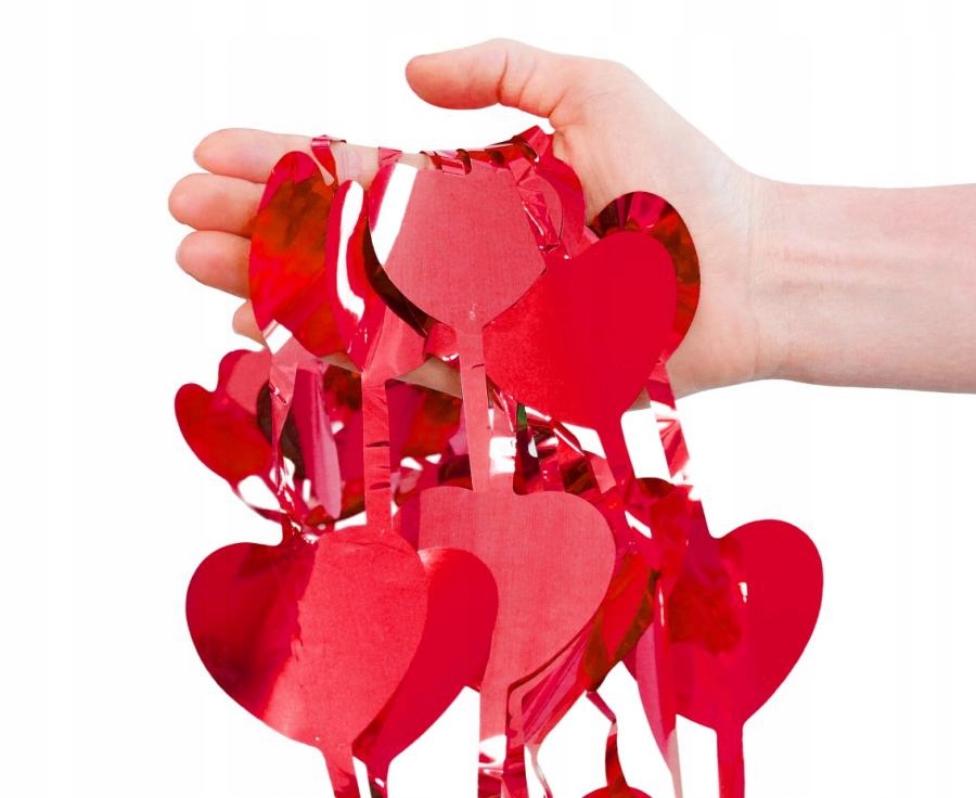Фотоштора в форме красных металлических сердечек – отличная идея ко Дню святого Валентина.