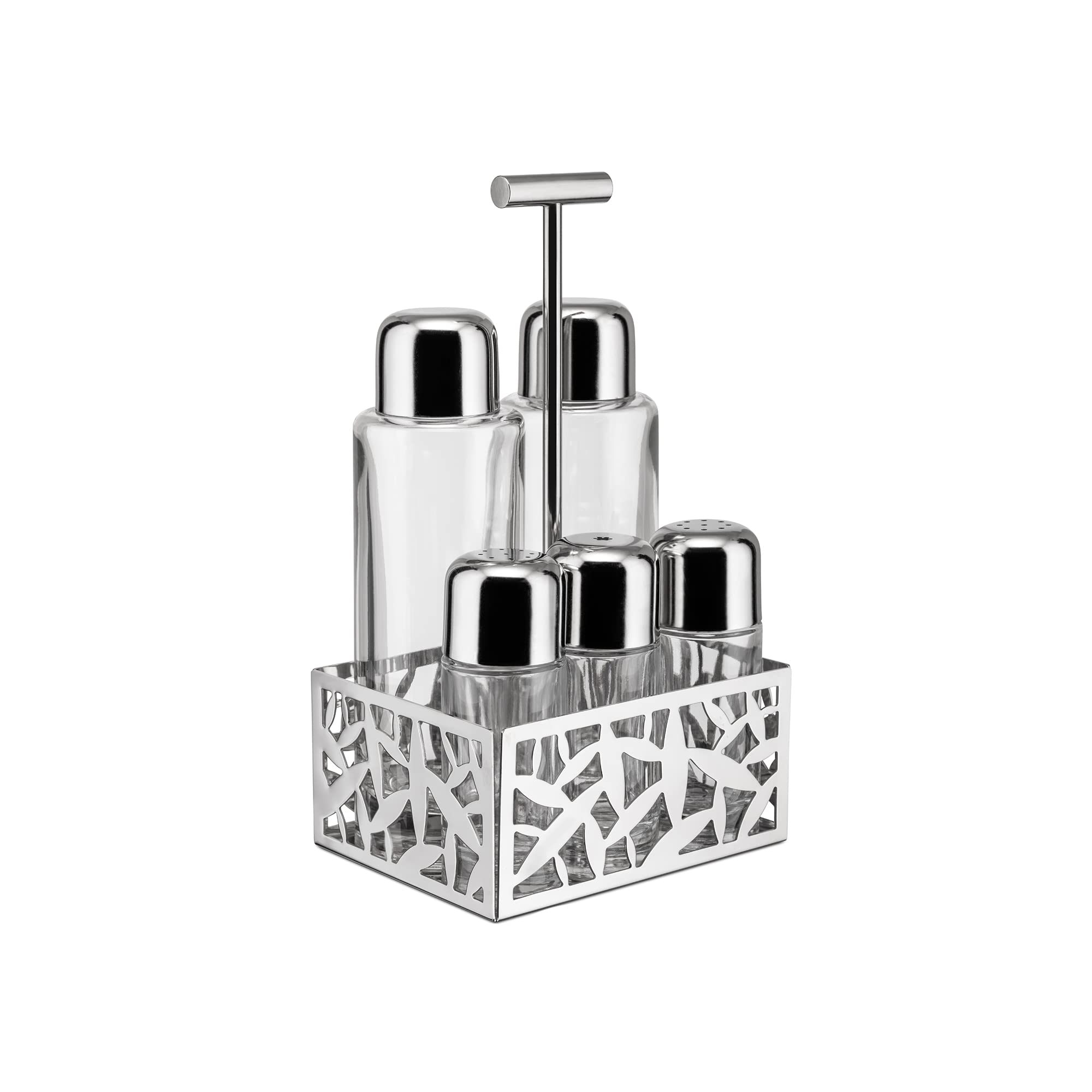Набор Alessi Kaktus станет прекрасным дополнением вашей кухни. Форма кактуса, разработанная Мартой Сансони, в сочетании с полированной нержавеющей сталью 18/10 и стеклом делает набор для специй не только практичным, но и эстетичным. Размеры: 22,7 см х 12,3 см х 10 см позволяют удобно расположить специи в одном месте. В наборе: масло, уксус, соль, перец и специи.