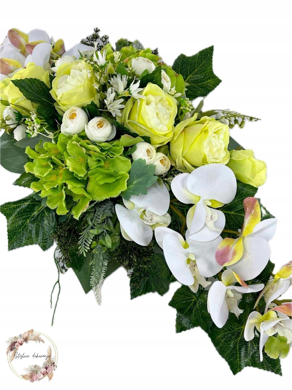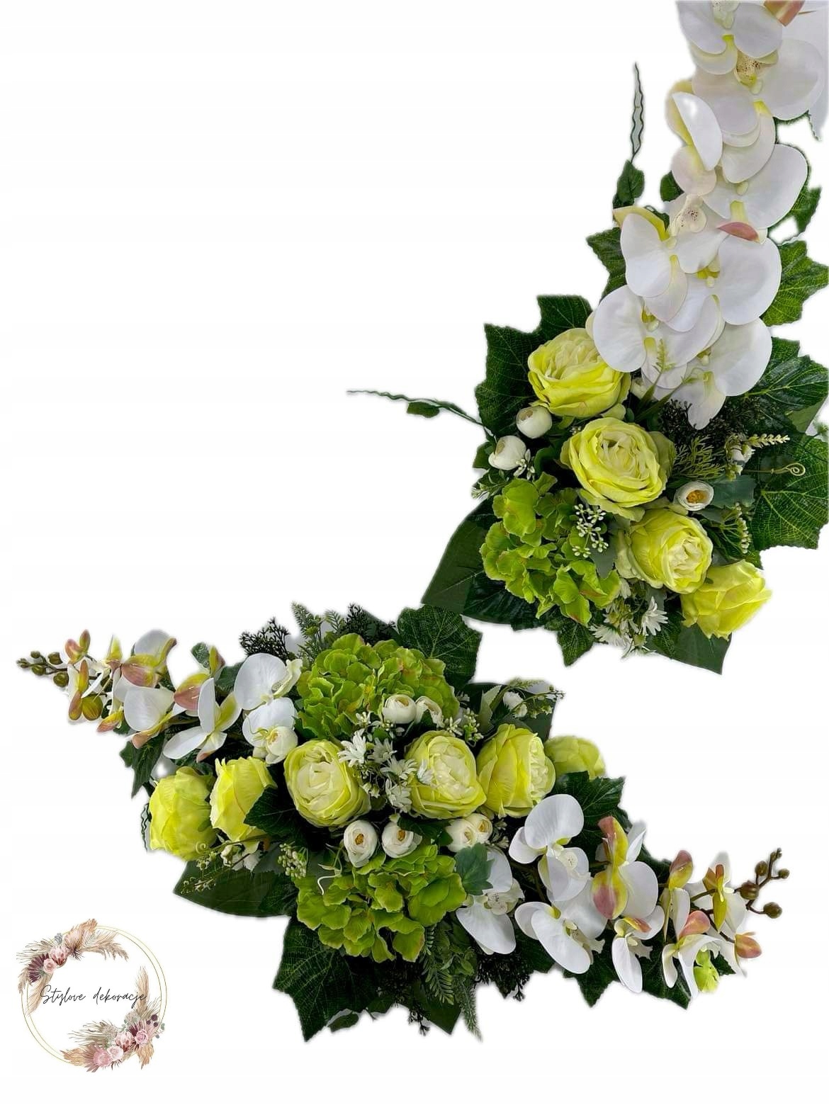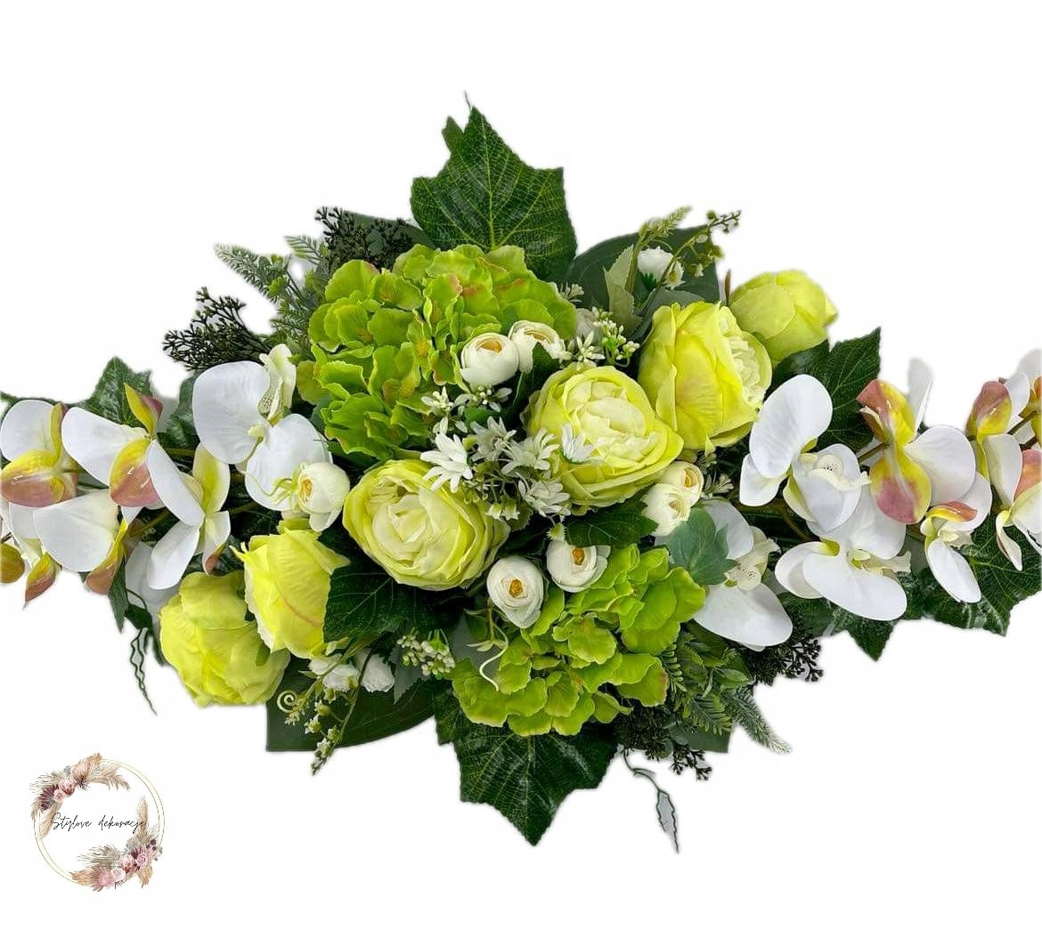 - из искусственных цветов зеленого цвета и белый с насыщенно-зелеными растениями,