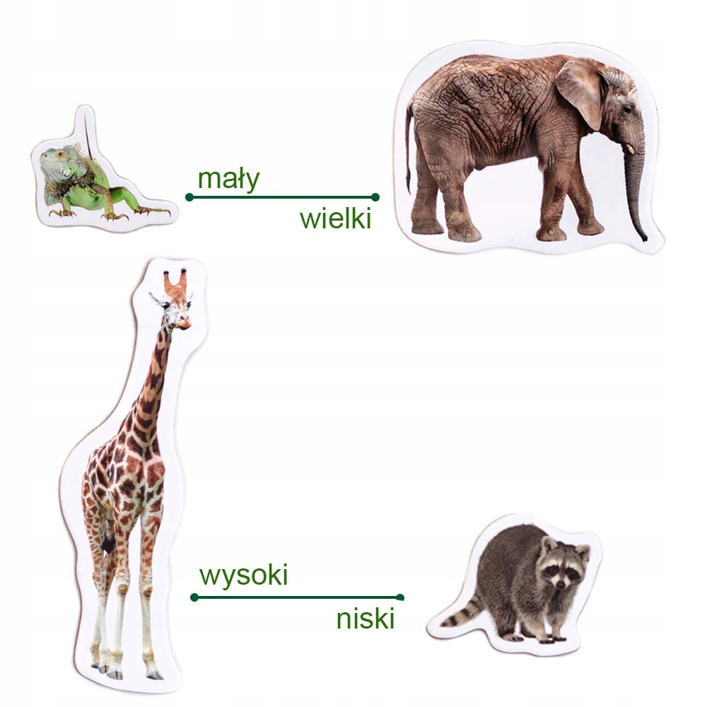 В комплект входят 19 больших, толщиной - 3 мм, реалистичных магнитов с закругленными краями. Магниты можно классифицировать, группировать, располагать по размерам, одновременно изучая названия животных.