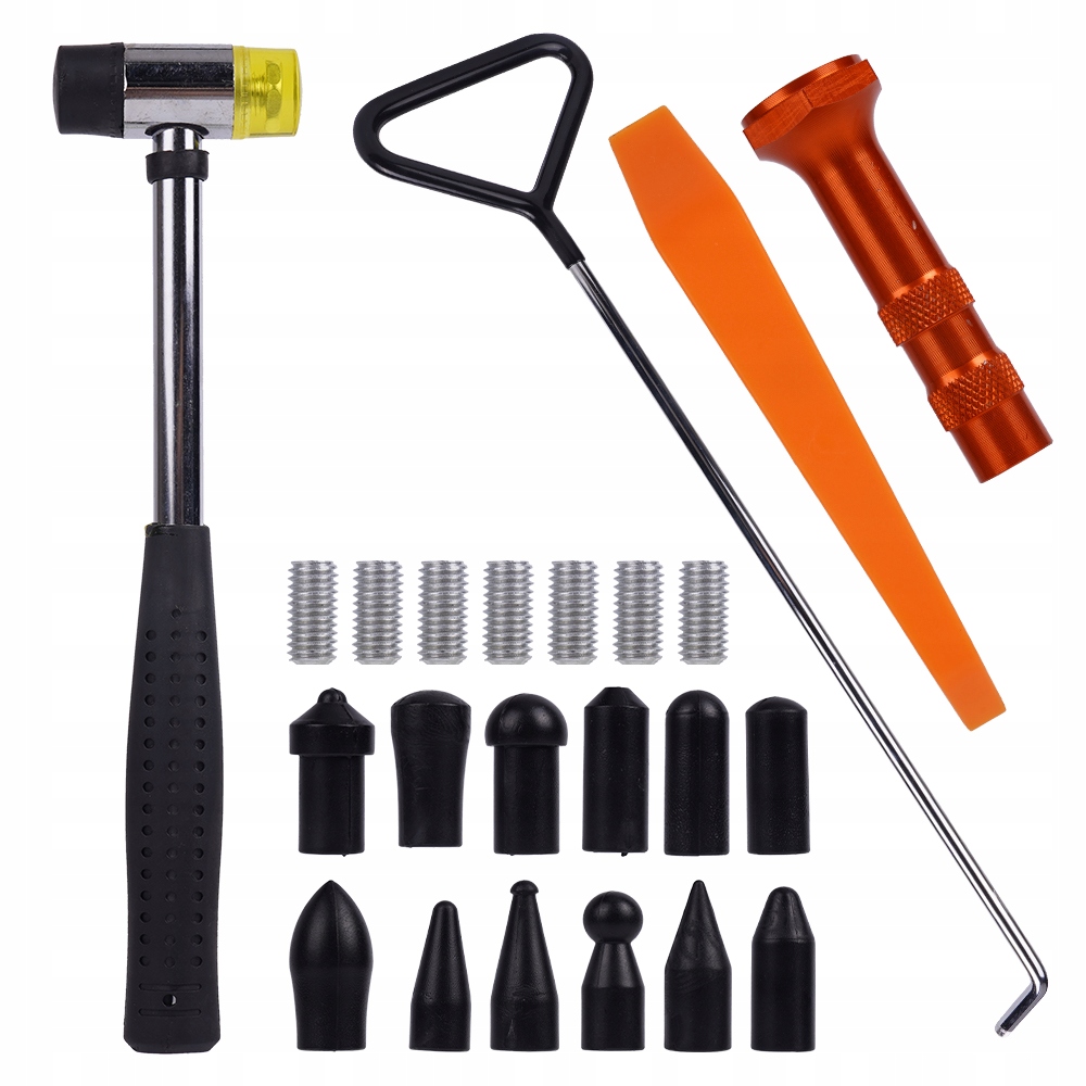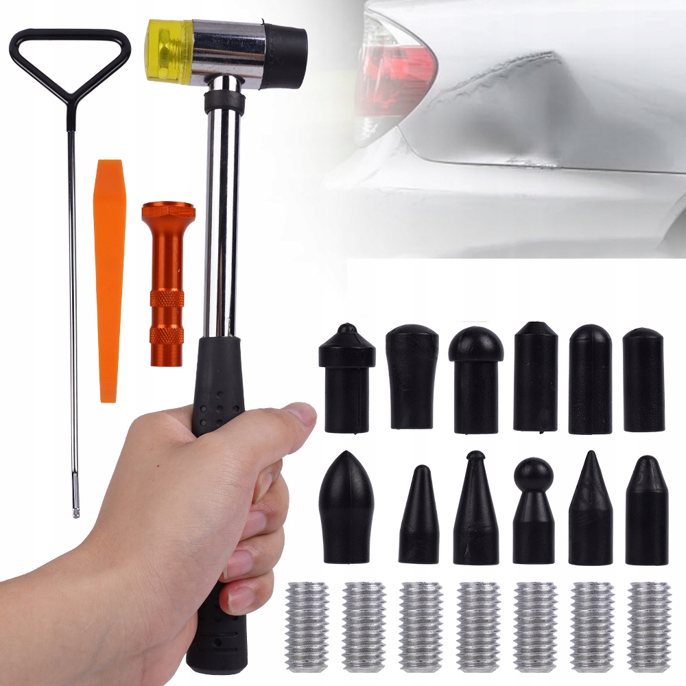 -Черная головка молотка изготовлена из высококачественной стали с высокой твердостью, не легко сломать и сильный. Оснащен 9 насадками разной формы, вы можете выбрать нужную в зависимости от размера вмятины или изгиба.
