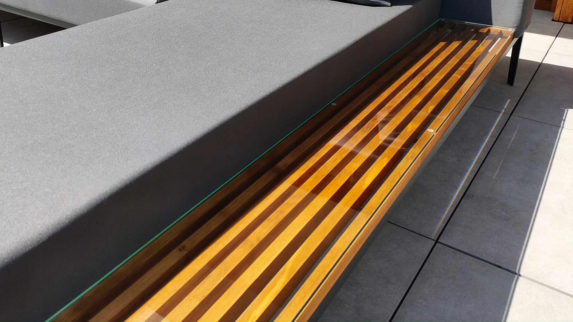 - Шезлонг с приставным столиком, отделка из дерева и стекла.