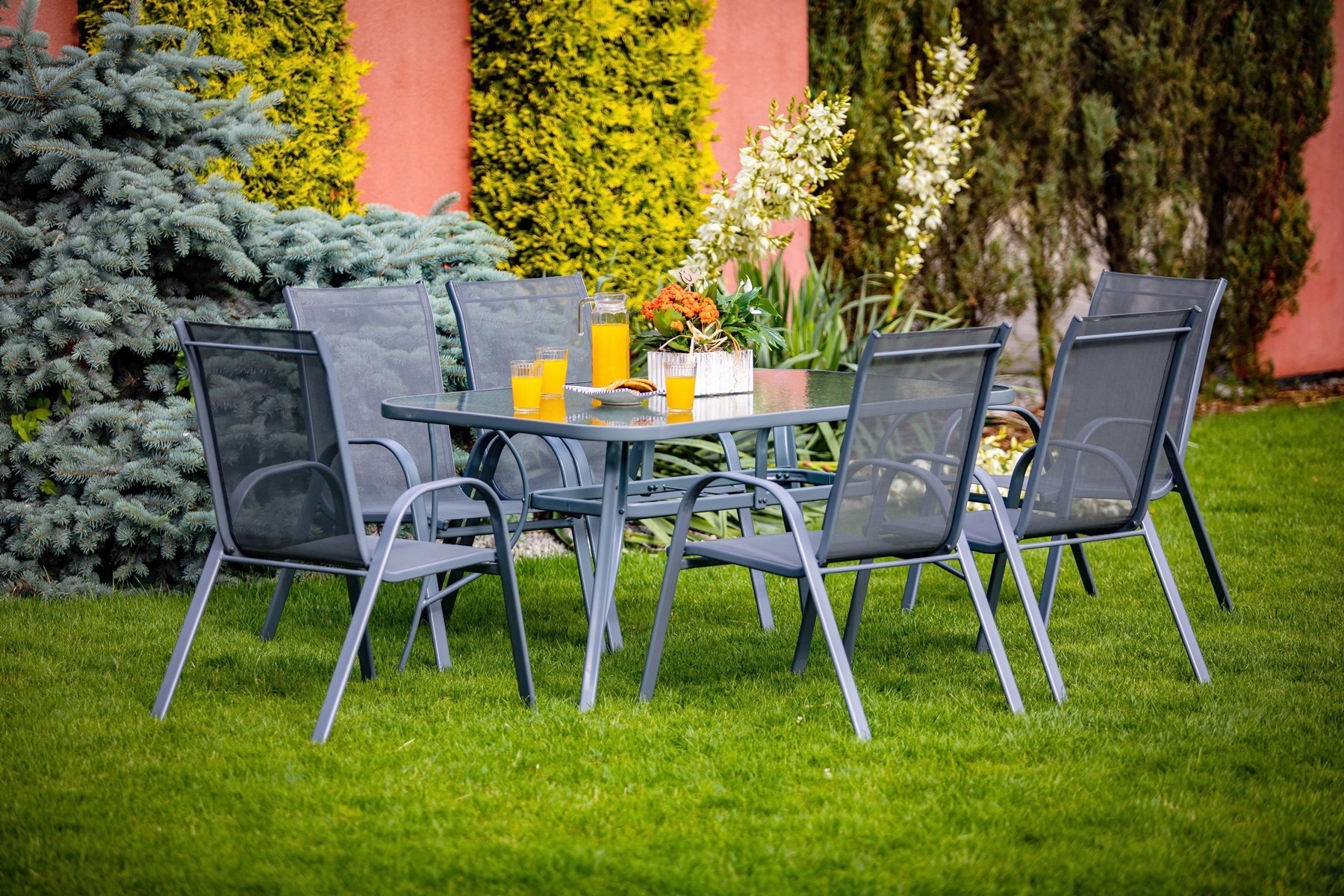 НАБОР САДОВОЙ МЕБЕЛИидеально подходит для вашего сада. Каркас имеет двойное порошковое покрытие, что делает этот продукт идеальным для использования как внутри, так и снаружи помещений. Сиденье и спинка стула выполнены из антрацитово-серого цвета, гибкая текстильная обивка обеспечивает максимальный комфорт. Имеет две боковые спинки. Используемые материалы не требуют частого ухода, устойчивы к погодным условиям и не требуют специальных средств по уходу. Ножки дополнительно оснащены пластиковыми чехлами. Столешница выполнена из декоративного закаленного стекла. 5 мм, с отверстием для вставки садового зонта.