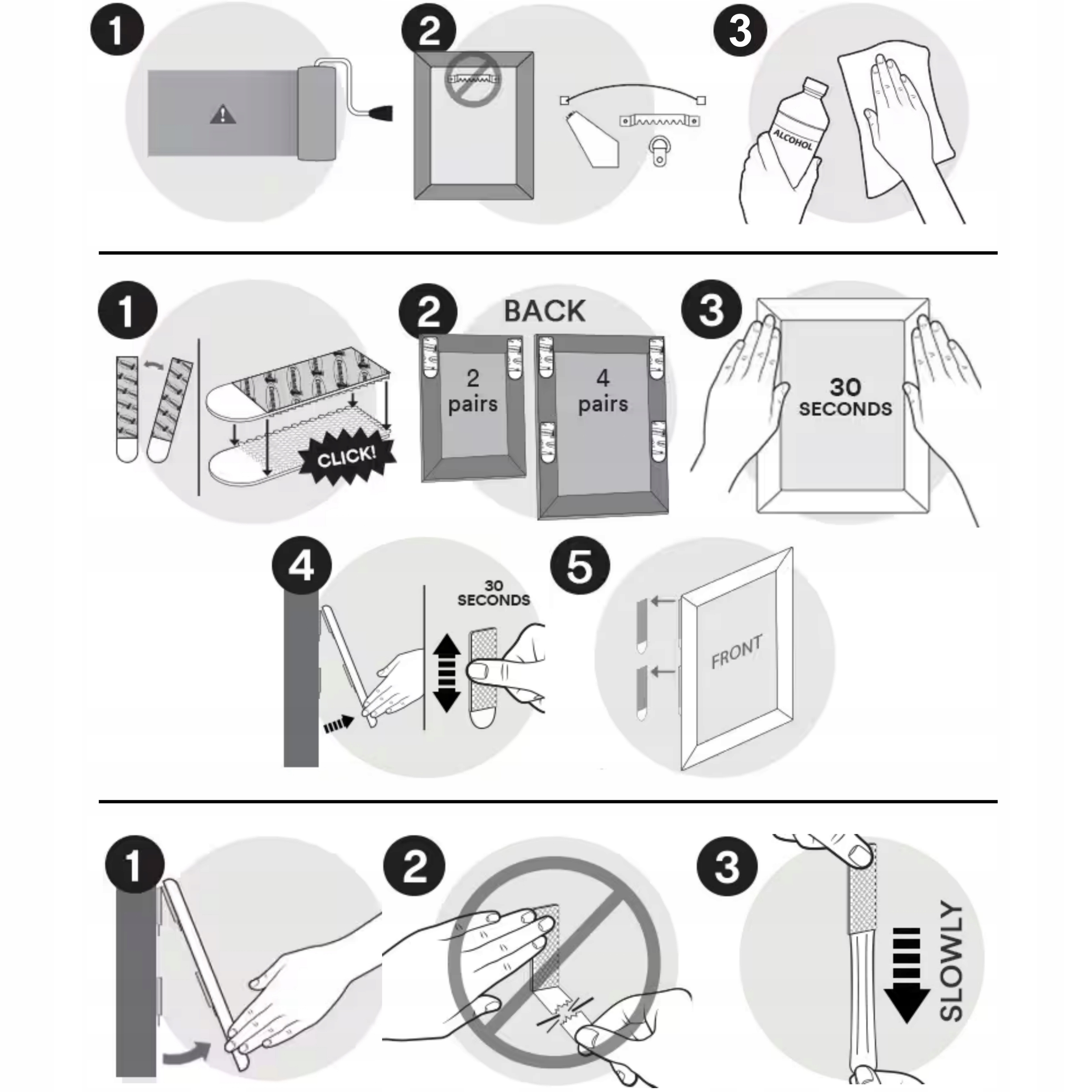 ➡ Подождите 7 дней после покраски поверхности перед использованием липучки; Не используйте на поверхностях кадров, которые покрыты бумагой или тканью; Не используйте домашние чистящие средства, такие как ткани или спреи, потому что они оставляют скользкое отложение; Повторите это с другими парами липучков, как показано выше. Поместите нижнюю пару липучки примерно на 2/3 ниже вершины рамы. Проверьте допустимые пределы нагрузки на упаковке; Нажмите на каждый из фрагментов рамки примерно в течение 30 секунд; Не тяните по прямой линии. Затем нажмите оставшуюся стену липучки около 30 секунд. Убедитесь, что вы нажмите на весь ремень; Установите липучку, прикрепленную к раме в одной линии с липучкой, прикрепленной к стене. Нажмите твердо, пока пары липучки не перемещаются и нажмите характерно; Не тяните по прямой линии; Всегда потягивайте, как можно больше; Растягивайте ремешок до 30 см, пока крючок не снимается;