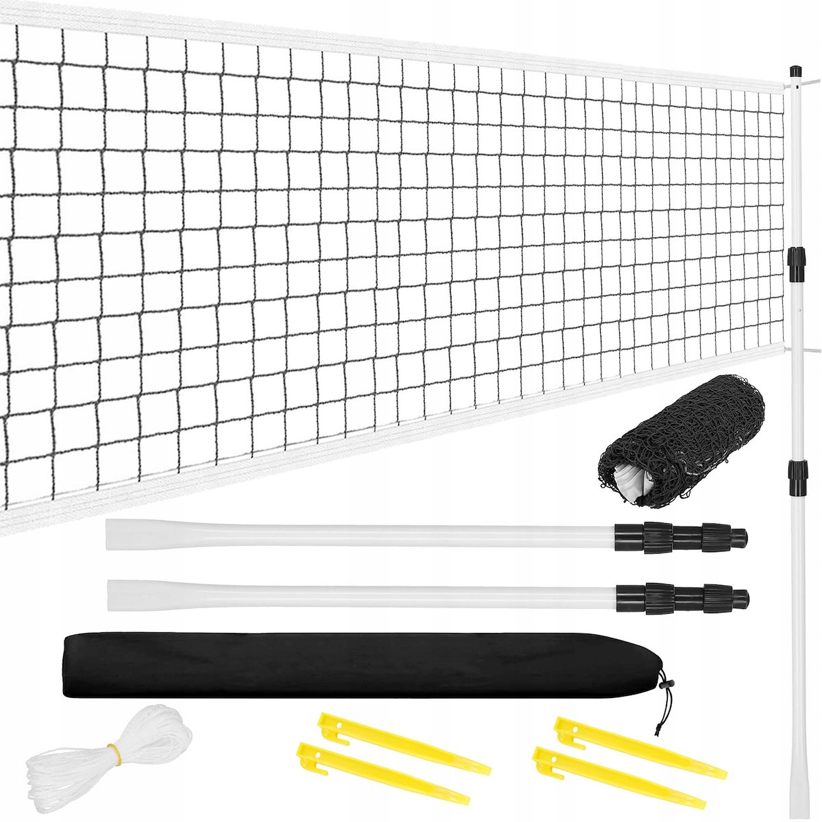 📌 Распакуйте элементы набора — регулируемые стойки, сетку, колышки и чехол.