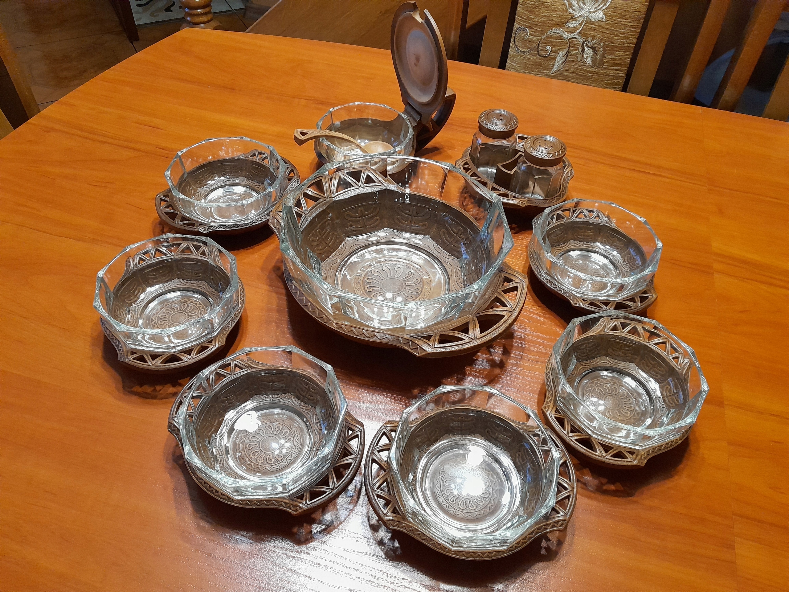 1 Большая чаша (диаметр 19 см) с подставкой, кондитерской (диаметр 11 см) с подставкой и позвоночником с подставкой (перцем и солью)