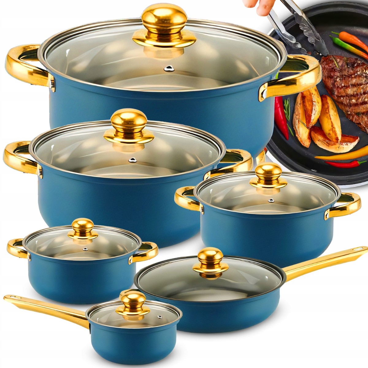 Набор стальных горшков и синей сковороды с золотистыми добавлениями является идеальным решением для приготовления пищи, включая индукцию.