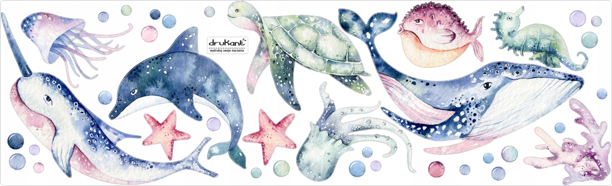 В набор входят наклейки с изображением морских животных: кита, дельфина, нарвала, черепахи, медузы, осьминога, морской еж, морской конек, коралл, морская звезда и пузырьки воздуха. Всего 11 наклеек с животными. Они напечатаны на матовой самоклеящейся пленке. Отдельные элементы на листе вырезаются и представляют собой отдельные наклейки - готовые к наклеиванию. Размеры указаны на фото ниже.