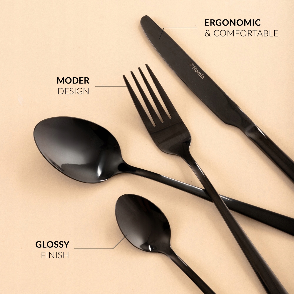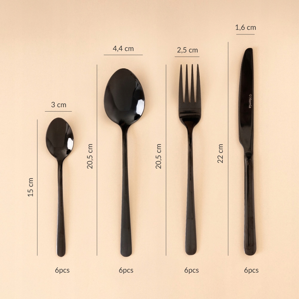 СТОЛОВЫЕ ПРИБОРЫ LUGANO идеально подходит для повседневного использования, а благодаря красивому дизайну он также идеально подходит для особых случаев, таких как случайные вечеринки, семейные ужины, гала-ужины, сочельник, пасхальный завтрак. Они непременно станут украшением любой элегантной сервировки стола. Черный цвет столовых приборов идеально вписывается в современные композиции и модернистскую посуду.