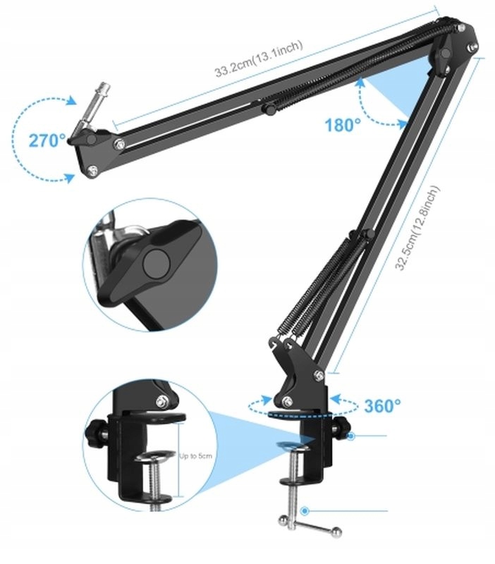Устойчивая конструкция и зажим в сборе позволяют подвешивать микрофон таким образом, чтобы не касаться микрофона во время работы. Комплект можно использовать для крепления большинства микрофонов диаметром до 3 см.