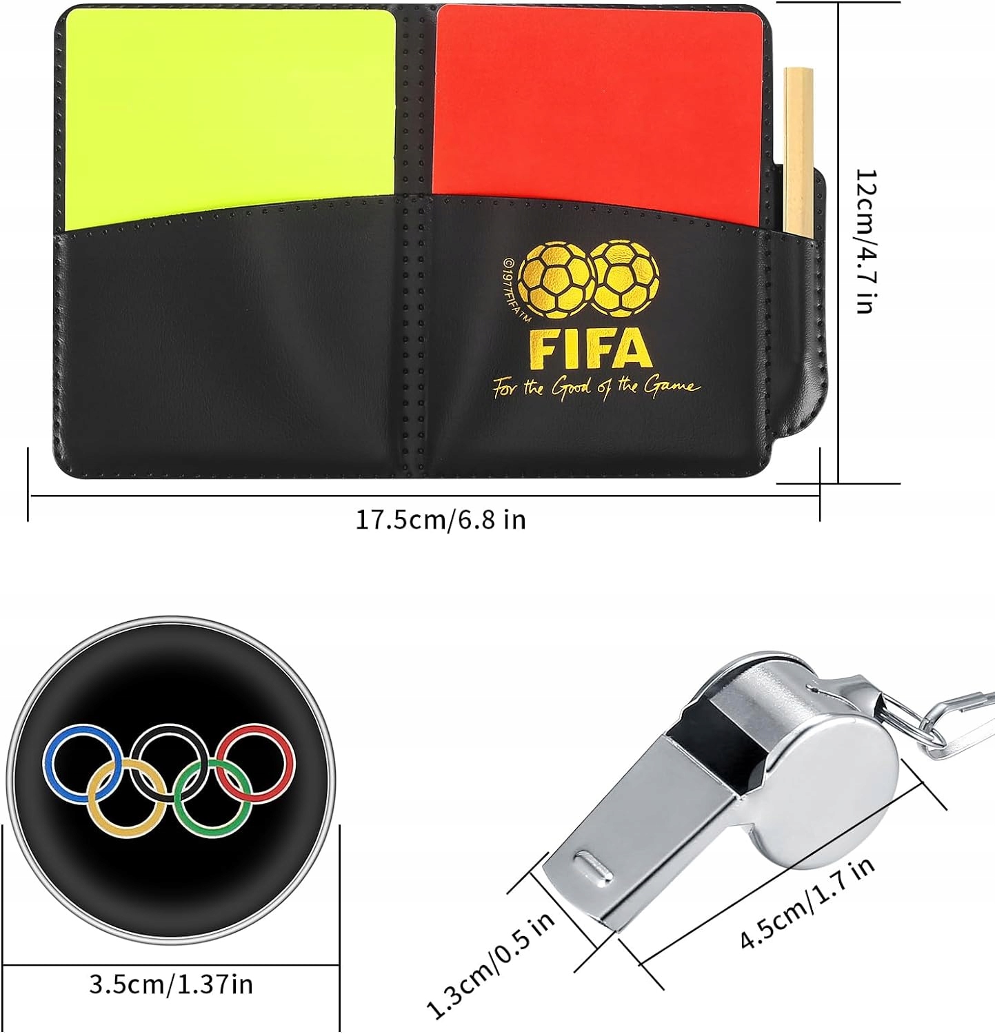 В наш набор входят красная карточка, желтая карточка, свисток + блокнот с карандашом. Может удовлетворить потребности футбольного арбитра.