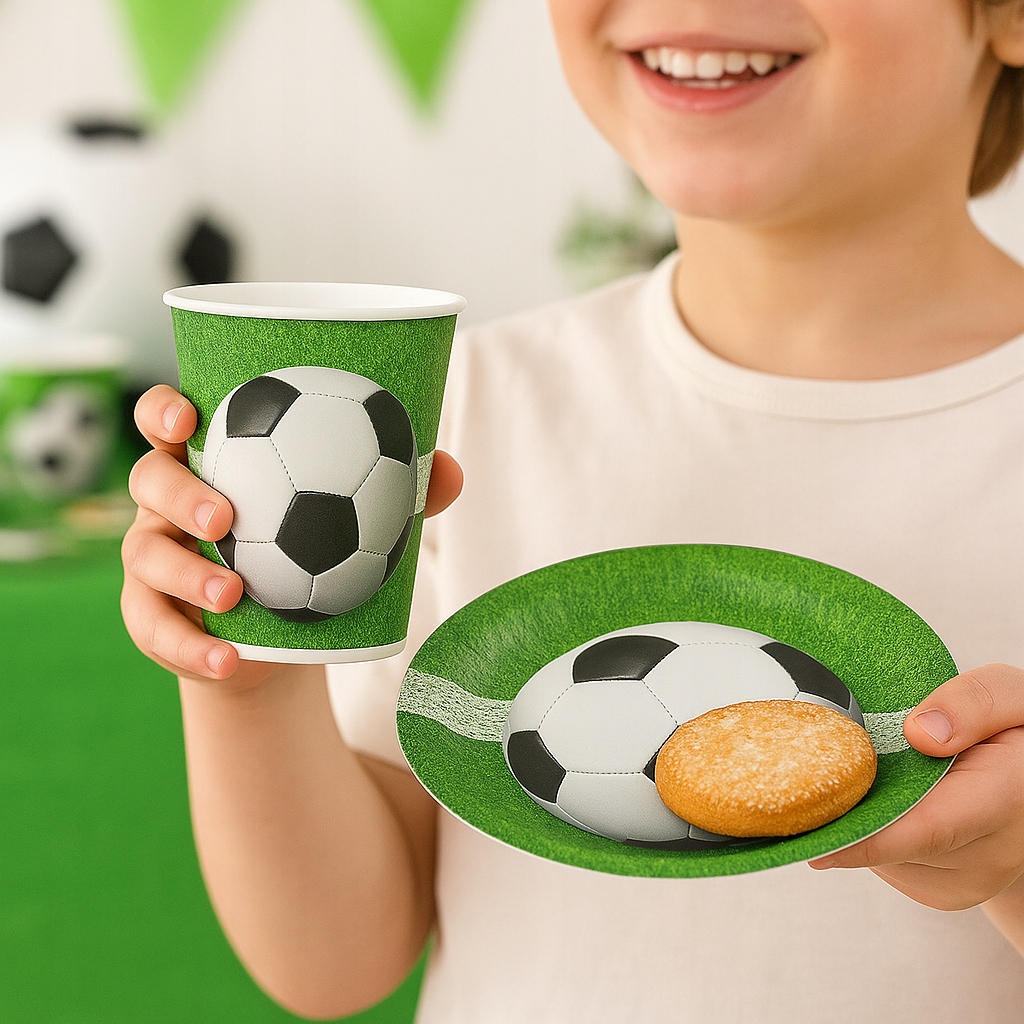 Забудьте о сборе элементов по отдельности. В нашем наборе «Футбольный день рождения» у вас есть все необходимое: тарелки, чашки и салфетки с футбольным мотивом. Это быстрый и эстетичный способ украсить стол без стресса и лишних затрат.