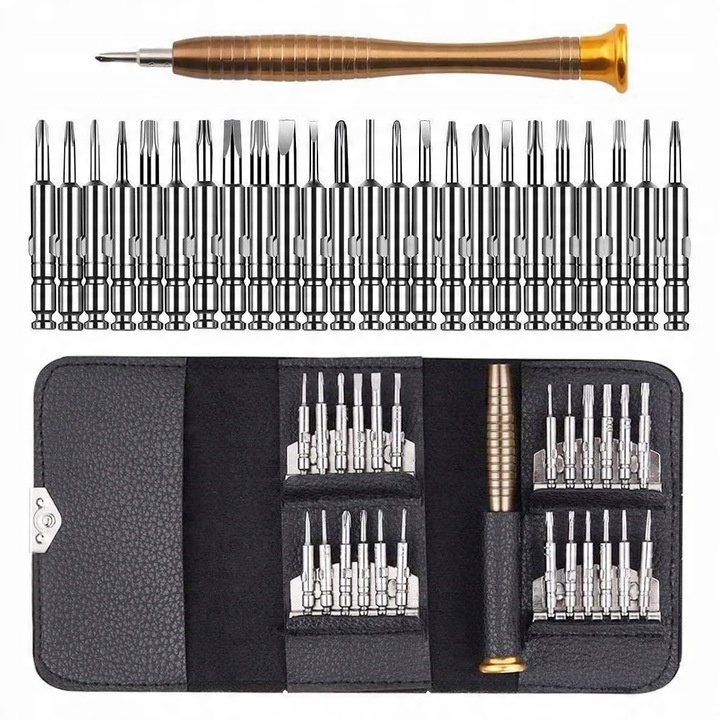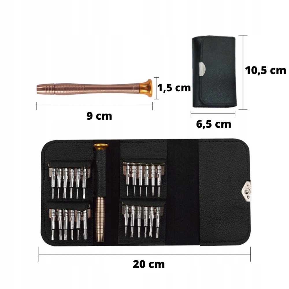 Наш набор состоит из 25 элементов в закрытом корпусе. Это определенно оправдает ваши большие ожидания. Это поможет в эффективной организации рабочего места и, следовательно, в быстром и точном выполнении. Набор также предназначен для ремонта всех других устройств и оборудования, имеющих нестандартные, мелкие винты. Он также идеально подходит для мелкого домашнего ремонта, требующего отверток.