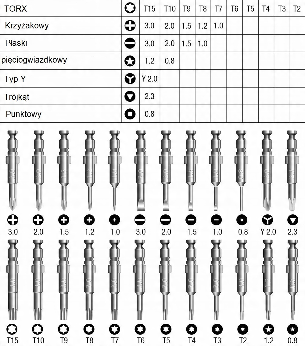 - TORX: T15, T10 T9, T8, T7, T6, T5, T4, T3, T2 b >