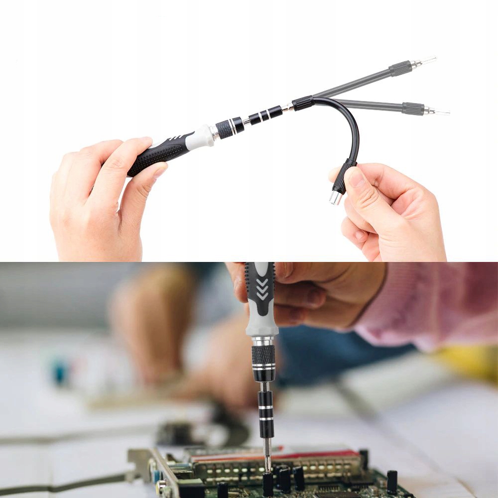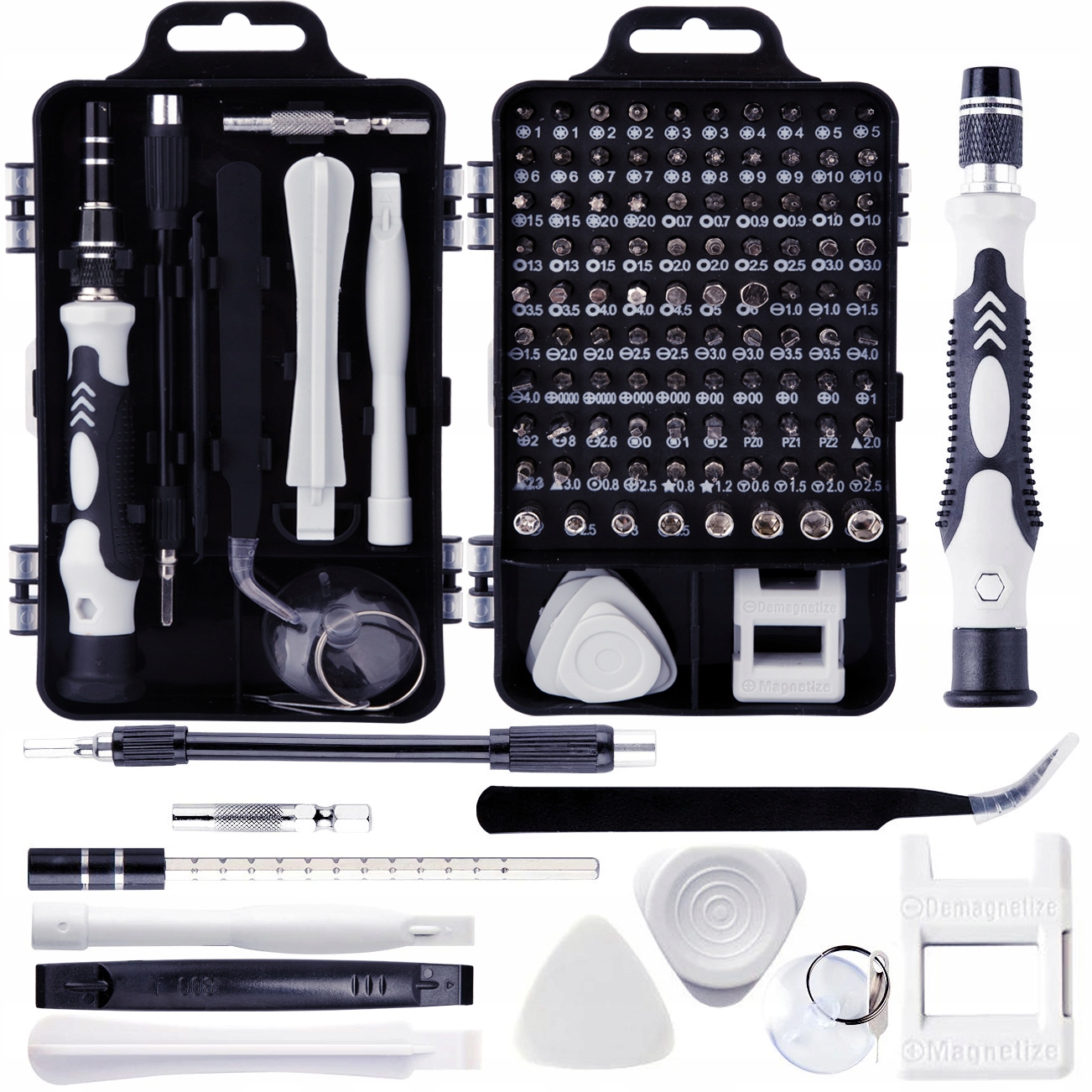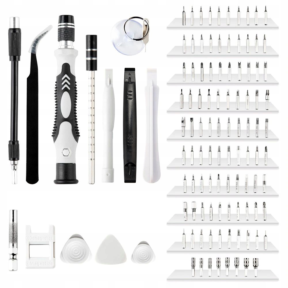 В наш комплект входит все необходимое для ремонта и обслуживания электроники. Удобный профилированный держатель позволяет комфортно и стабильно монтировать и использовать одну из прецизионных бит. Гибкое удлинение облегчает доступ к труднодоступным местам. Пинцет с загнутым кончиком подойдет, набор пластиковых открывашек и присоска облегчат работу. Магнитайзер позволит вам намагничивать или размагничивать наконечники в зависимости от ваших потребностей.