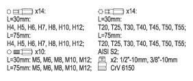 Профессиональный набор бит для откручивания специальных винтов типа шестигранник, торкс, шлицевой. Разнообразие бит позволяет выполнять множество работ в специализированных механических и автосервисах. Наконечники имеют две длины: 30 и 75 мм, закреплены в шестигранном держателе диаметром 10 мм, приспособленном для работы с трещотками 1/2" и 3/8". Набор изготовлен из легированной инструментальной стали S2 высочайшего качества, которая характеризуется: