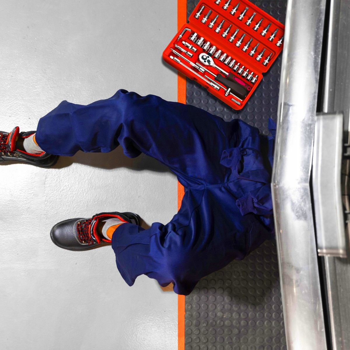 Набор инструментов в практическом кейсе содержит 46 предметов, таких как головки, биты и трещотки, предлагая все необходимое для точных и различных работ.