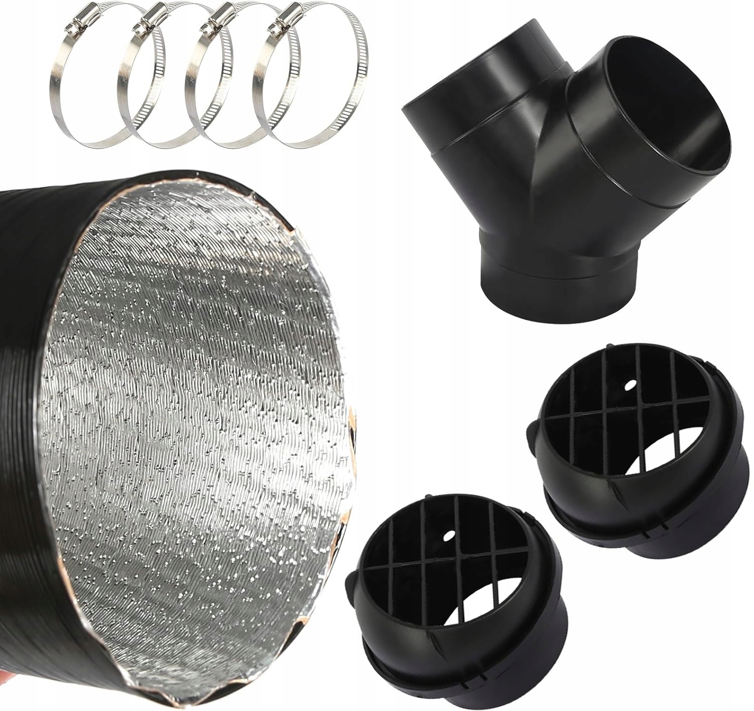 🚗🚗 В комплект поставки входят: 2 нагревательных канала диаметром 75 мм + 2 нагнетателя теплого воздуха диаметром 75 мм + 1 Y-образная труба диаметром 75 мм + 4 хомута для шлангов.