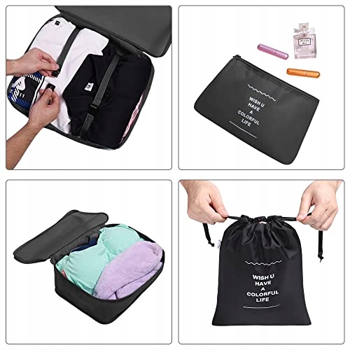 - 8 органайзеров для упаковки: 4 дорожные сумки для одежды, 1 сумка для нижнего белья, 1 сумка для обуви и 2 кармана позволяют легко организовать ваши вещи, удовлетворяя все ваши потребности в путешествии.