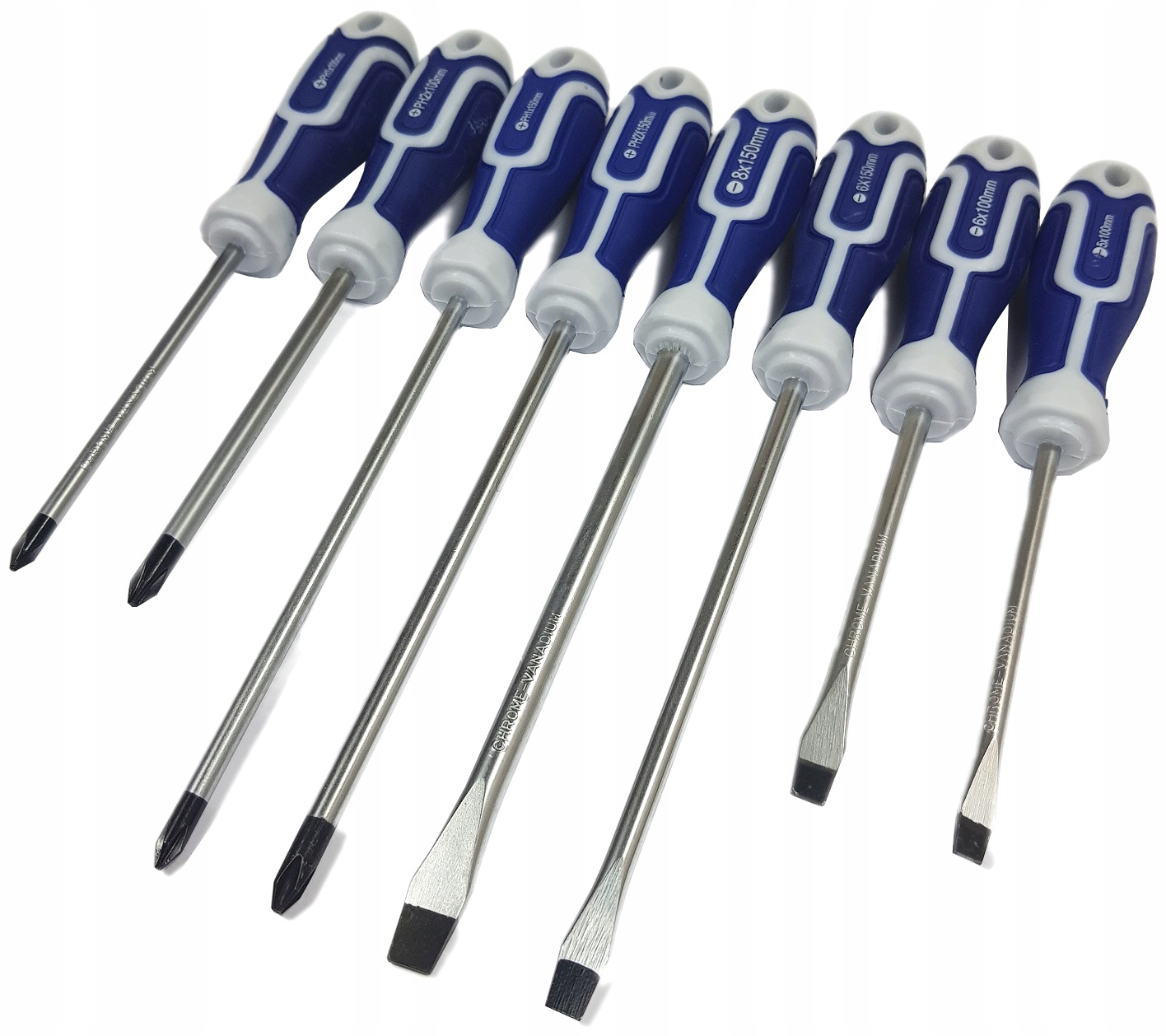 - 8 отверток с плоской головкой: 8x150/6x150/6x100/5x125/5x100/ 5x75/4x100/3x75 мм