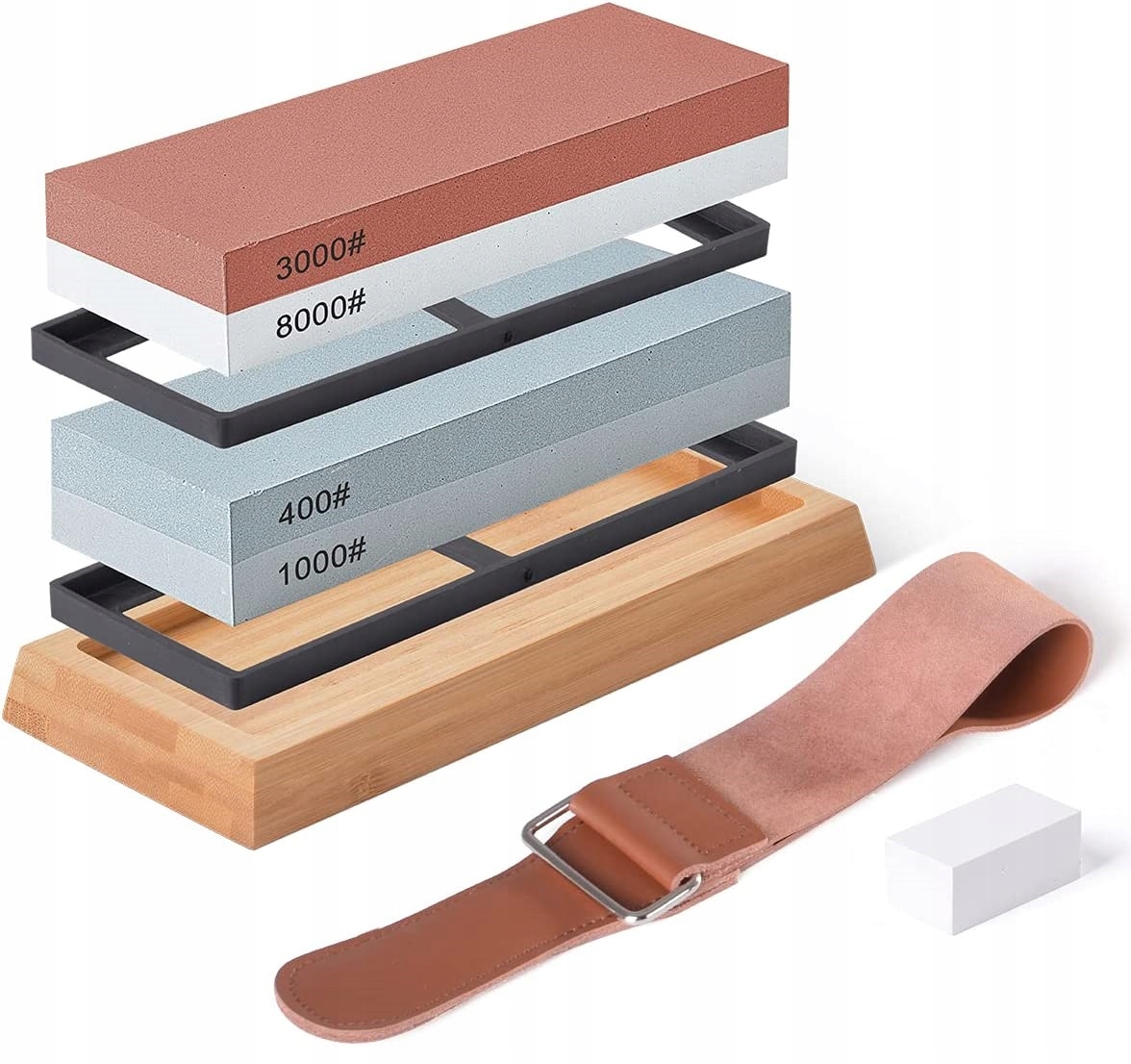 Помимо камней в набор входит эстетичная бамбуковая подставка, кожаный ремешок для чистки лезвия, белый ремонтный камень и кожаный ремешок для снятия заусенцев и заточки лезвия. Каждый точильный камень имеет противоскользящие резиновые накладки.