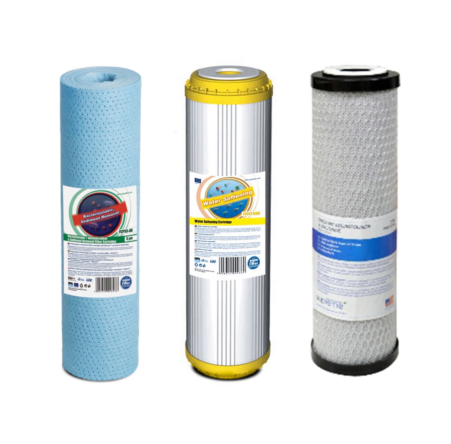 В комплект входит пенопластовый картридж 20 микрон (механическая фильтрация), угольный картридж из спеченного блока активированного угля (удаляет хлор, фенолы, пестициды и цисты, осветляет воду, улучшает ее вкус и аромат) и смягчающий картридж (удаляет кальций, т.е. накипь).