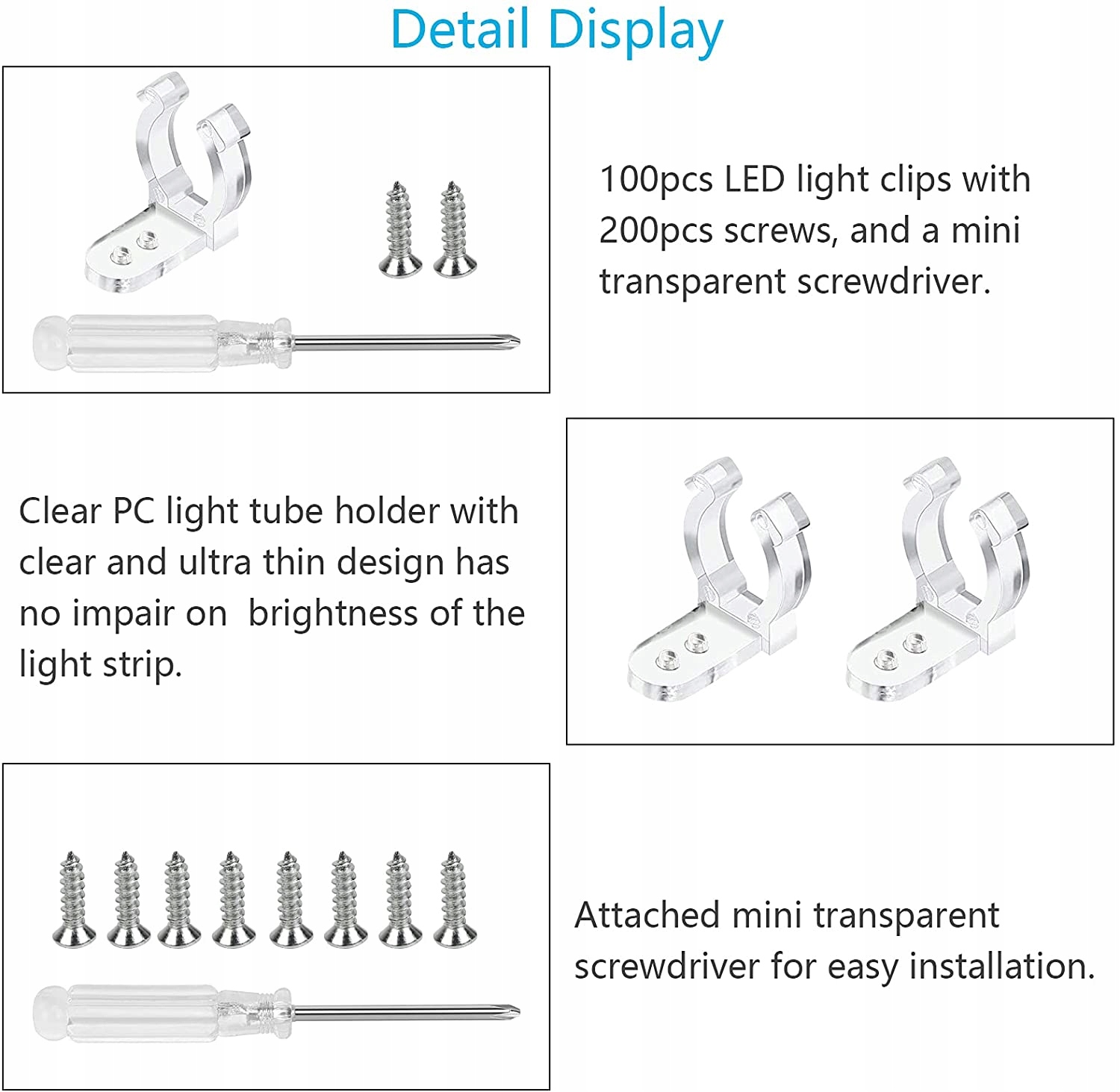 набор лопотина из 100 монтажных зажимов Светодиодный светодиодный светодиодный освещение с 200 винтами 1 отвертка Теутоническая отвертка Прозрачная держатель для лампы для сказочного света световой полоски h1>