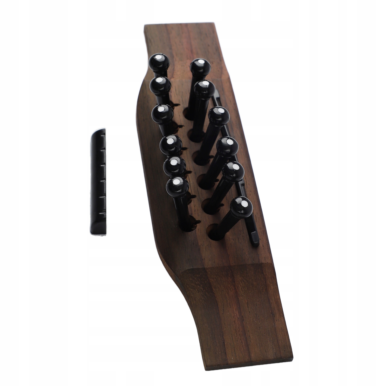 3. Палисандр и пластик: Бридж 12-струнной гитары изготовлен из палисандра, а седло и гайка бриджа изготовлены из пластика. И булавка черная.