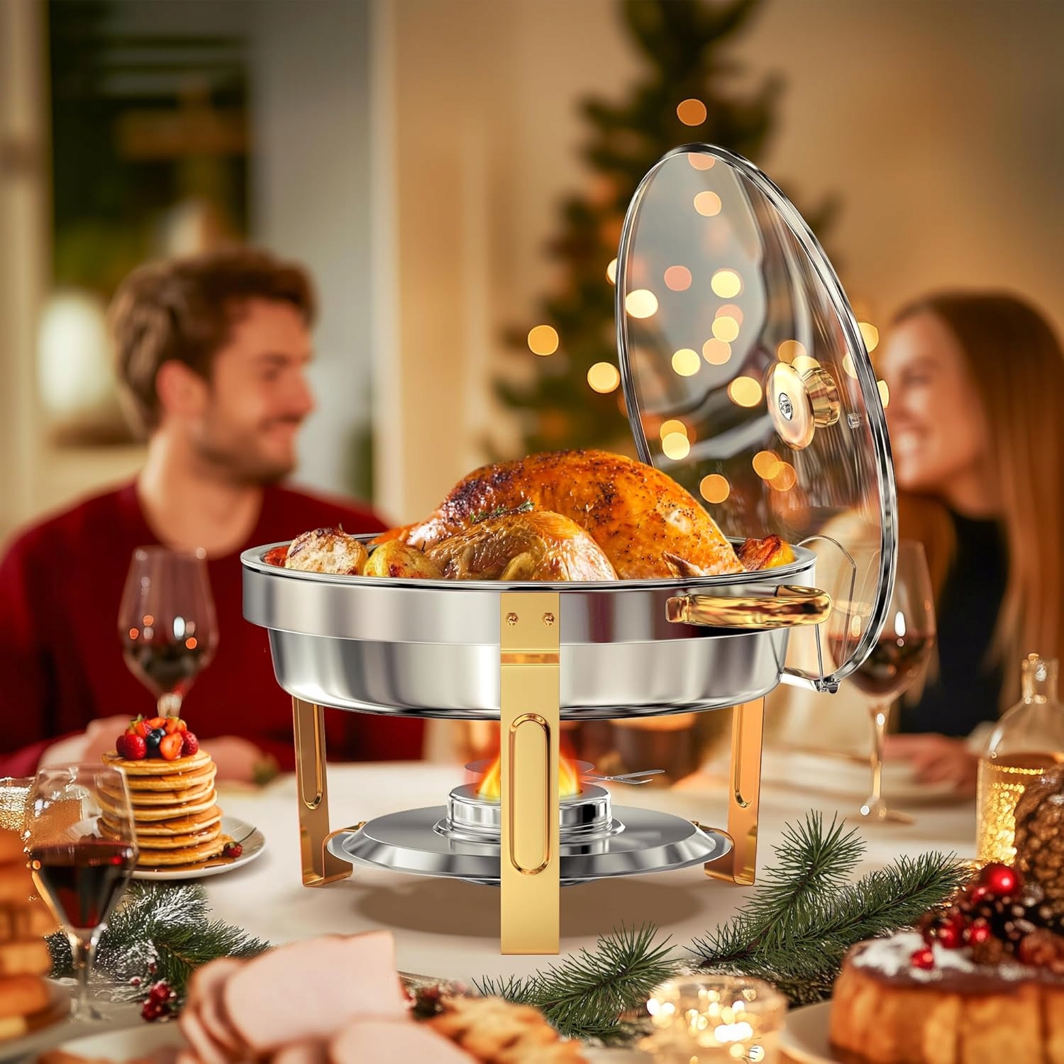 СМОТРИТЕ ЕДУ, НЕ ПОДНИМАЯ КРЫШКУ. Прозрачная стеклянная крышка золотого подогревателя позволяет легко видеть еду внутри, не открывая ее. Встроенные вентиляционные отверстия сохраняют свежесть продуктов, сводя к минимуму риск поломки, обеспечивая безопасность и гигиеничность шведского стола во время праздничных ужинов, семейных встреч или офисных мероприятий.