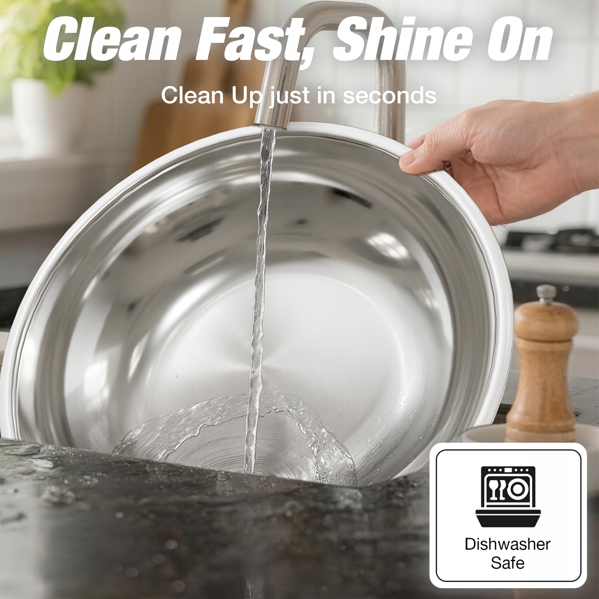 ЛЕГКО ЧИСТИТЬ И БЕЗОПАСНО МЫТЬ В ПОСУДОМОЕЧНОЙ МАШИНЕ — полированная поверхность из нержавеющей стали предотвращает прилипание продуктов, что делает очистку быстрой и легкой. Просто мойте вручную или помещайте в посудомоечную машину, чтобы сэкономить время и сохранить посуду для подогрева шведского стола из нержавеющей стали как новую