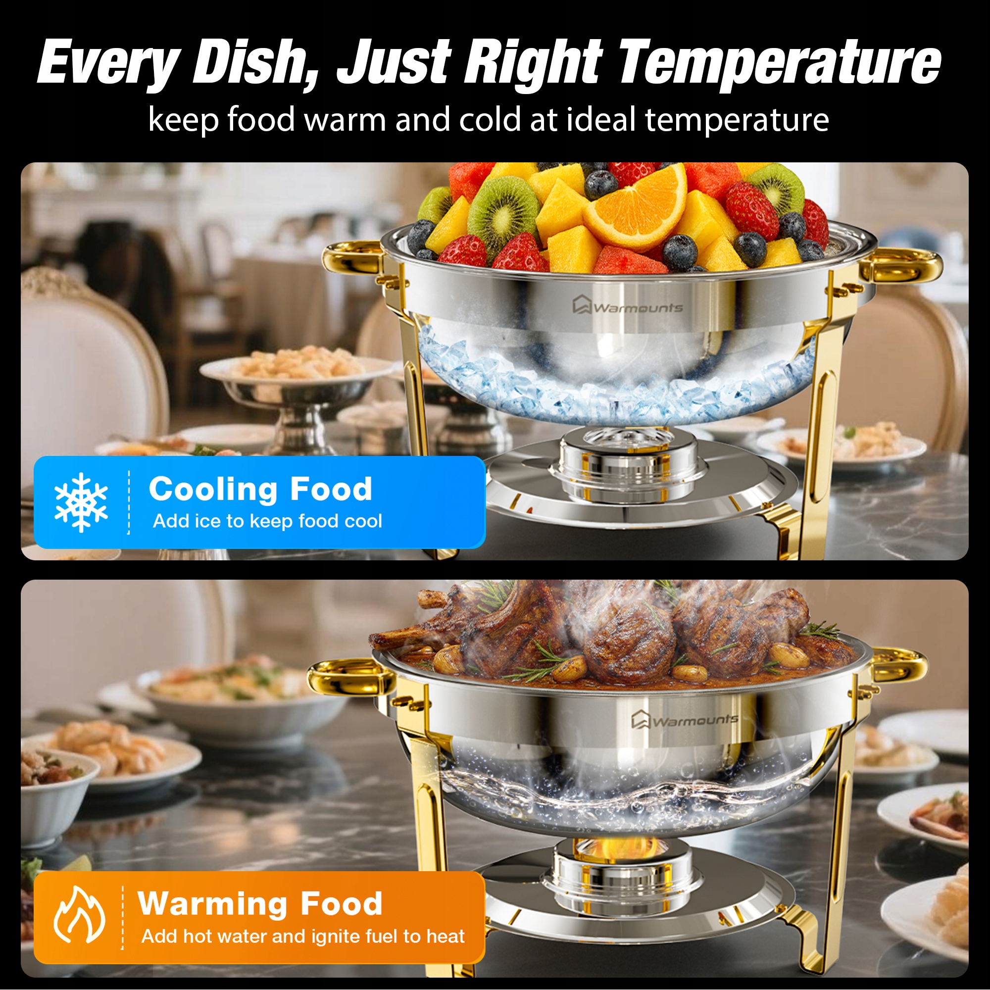 ИДЕАЛЬНЫЙ РАЗМЕР И ПОДДЕРЖАНИЕ СТОЛА В ЧИСТОТЕ - Подогреватели для шведского стола емкостью 5 литров (около 5 литров) подходят для небольших и средних встреч, фуршетов или кейтеринговых мероприятий. Держатель крышки удерживает крышку в поднятом положении, обеспечивая гигиеническую сервировку, не касаясь столов или столешниц.