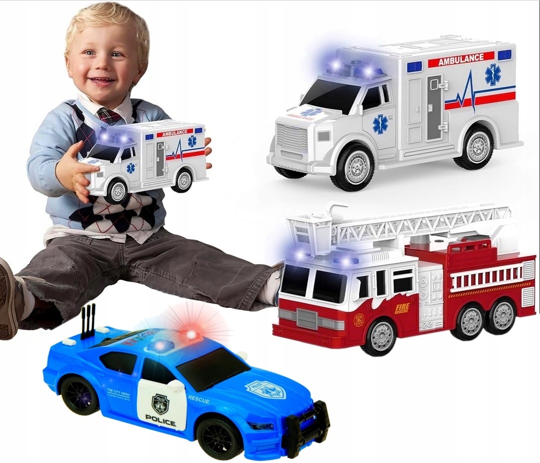 ZESTAW 3 POJAZDÓW AMBULANS WÓZ STRAŻACKI POLICYJNY RADIOWÓZ ŚWIATŁO DŹWIĘK