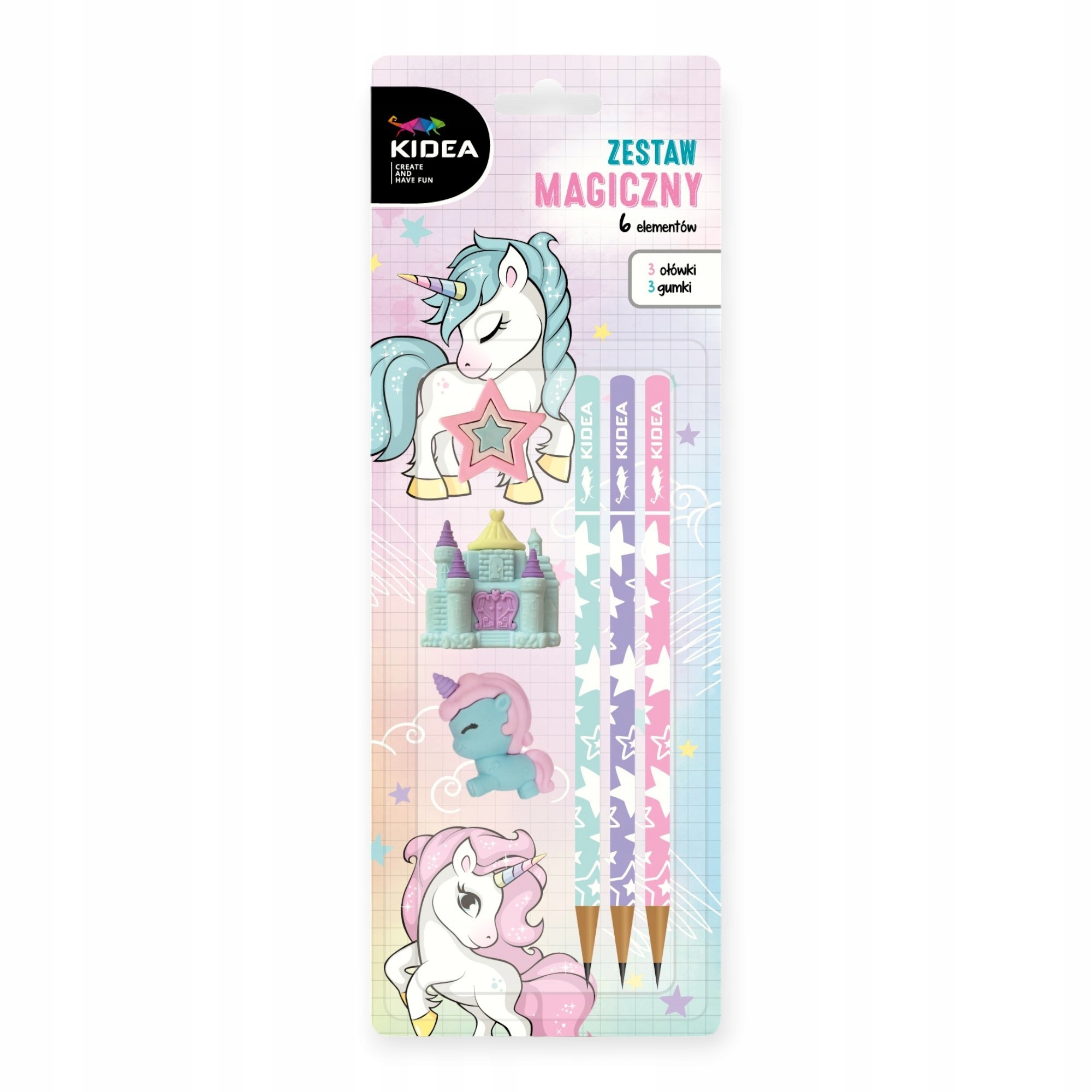 Дополните свой пенал очаровательным набором с волшебными мотивами! 3 карандаша и 3 ластика - в форме единорога, замка и звезды превратят обучение в удовольствие.