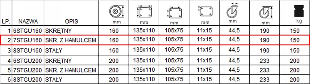 В комплект входят четыре колеса, установленные на шпильке с тормозом, код 7СТГУ160/37, в таблице под пунктом 2.