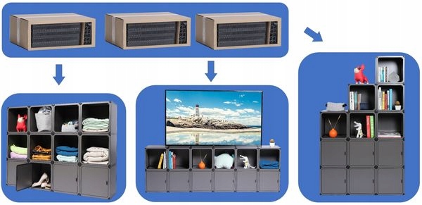 Шкафчики легко собираются, никаких инструментов не требуется — они просто скрепляются, как детские кубики, с помощью специальных отверстий и зажимов.