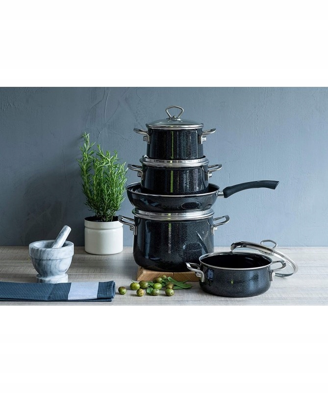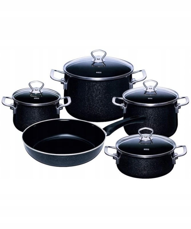 Набор из 5 шт. Black Magic RIESS — элегантная кухонная посуда, производимая в Австрии компанией Riess. Их керамическая поверхность была создана путем сочетания, среди прочего: кварц, калий, натрий, железо и другие минералы, обожженные при температуре 850°С. Благодаря этому они безопасны для здоровья, устойчивы к царапинам и антибактериальны.