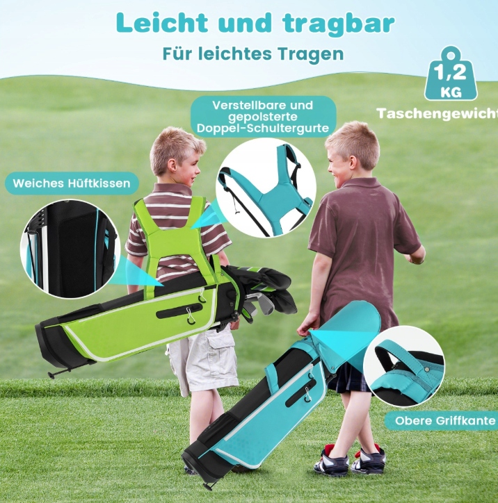 Введите своего ребенка в мир гольфа с этим полным набором палочек для гольфа для детей в возрасте от 11 до 13 лет. Оснащенная практическим дождевым покрытием, сумка гарантирует, что ракеты и аксессуары останутся сухими даже в неблагоприятную погоду. Легкая и прочная конструкция с двумя ремнями на плечах и верхняя ручка делает вашего ребенка легко носить собственную сумку на поле для гольфа. Набор полюсов для гольфа содержит алюминиевый водитель № 1 и гибрид № 5 с обложками, żelazki № 7, № 9, нет резинки