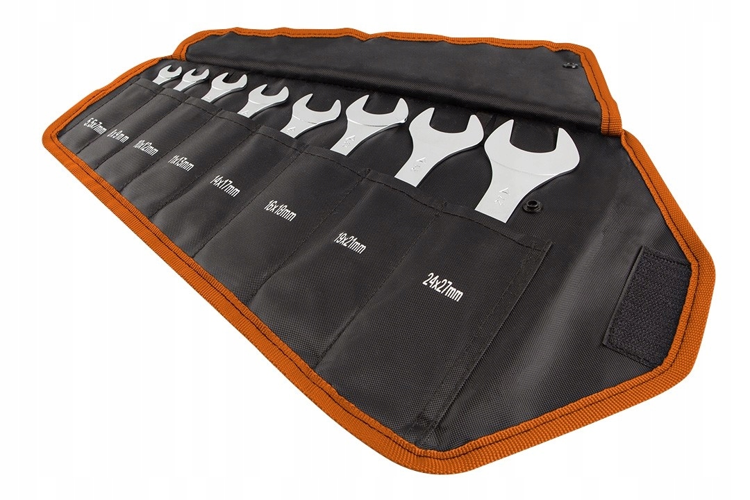 Набор из 8 двусторонних рожковых ключей толщиной 3 мм и размерами: 5,5 х 7 мм, 8 х 9 мм, 10 х 12 мм, 11 х 13 мм, 14 х 17 мм, 19 х 21 мм. мм, 22 х 23 мм, 24 х 27 мм.