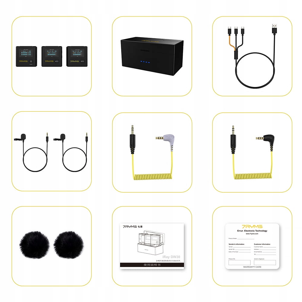 iRay DW30 — беспроводная микрофонная система от компании 7Ryms, предназначенная для работы с устройствами, оснащенными портом мини-джек 3,5 мм — фотоаппаратами, видеокамерами, звуком рекордеры, смартфоны и другие мобильные устройства. В комплект входят два кабеля — 3-контактный TRS и 4-контактный TRRS. Это позволяет подключать микрофоны к устройствам с двумя отдельными портами: микрофона и наушников, а также комбинированным портом мини-джек.