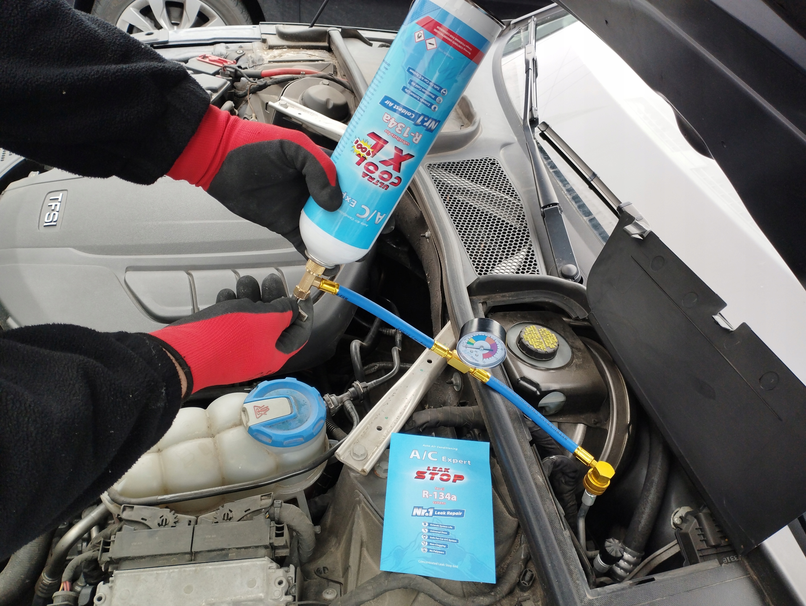 1. При возникновении утечки перед заполнением используйте герметик A/C Expert Leak Stop.