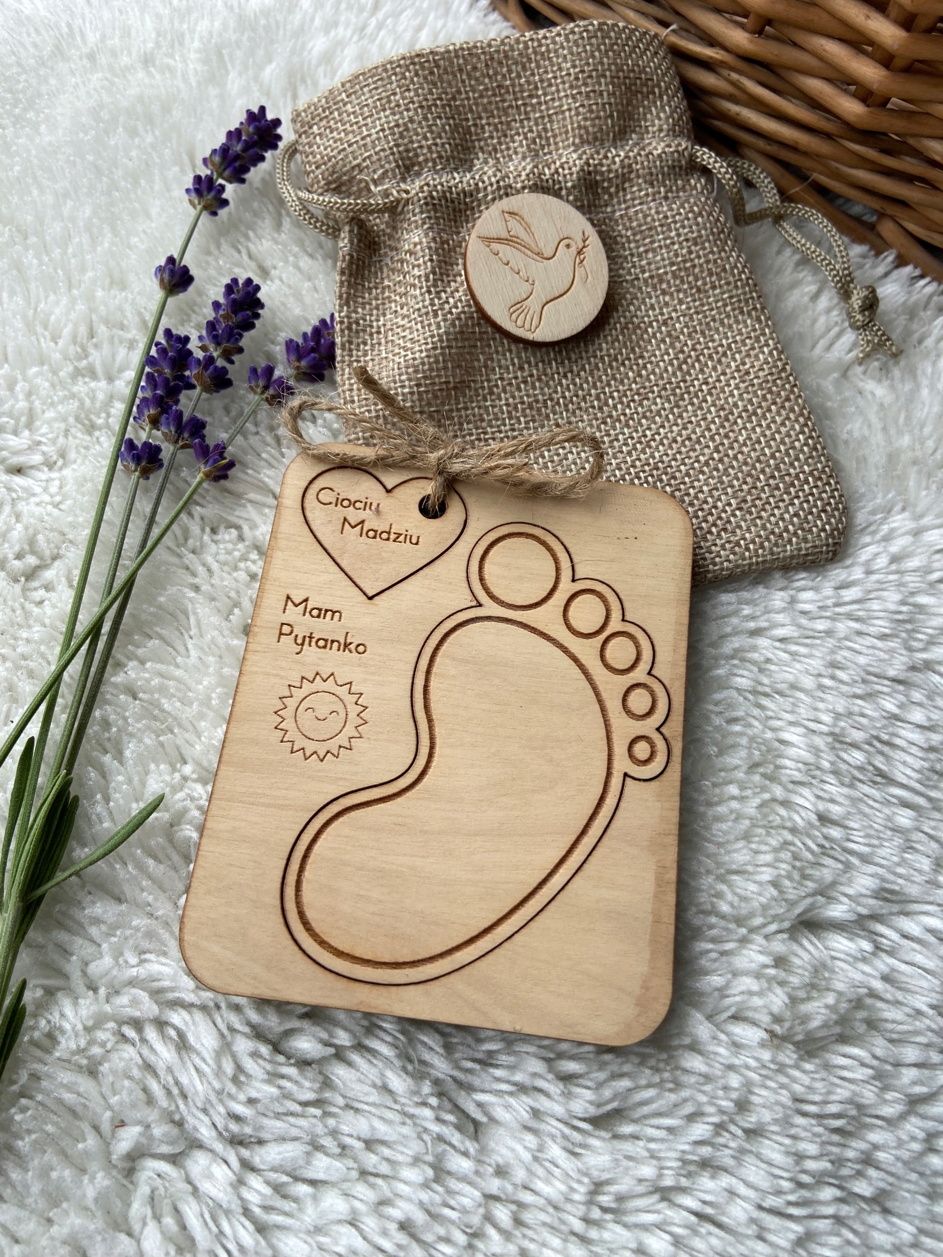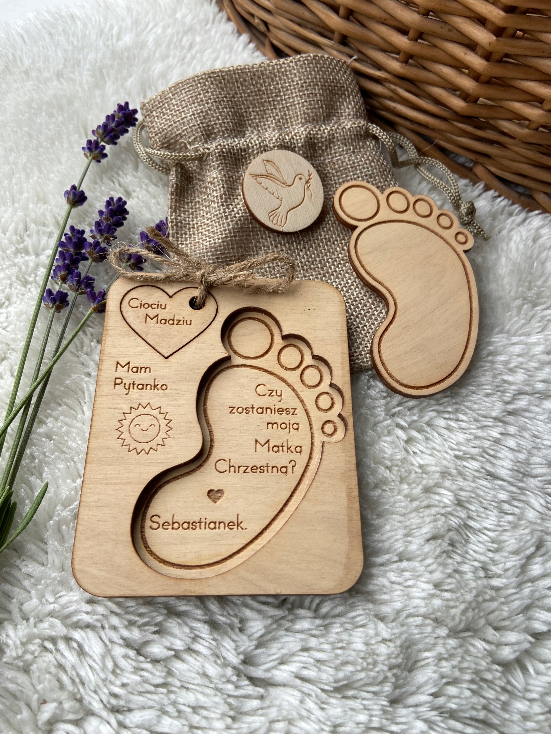 ❤️Дополнительно шнурок маленькое сердечко с выгравированной надписью: Тётя/Дядя (вместе с именем Крестной/Крёстного отца) связана джутовой тканью.