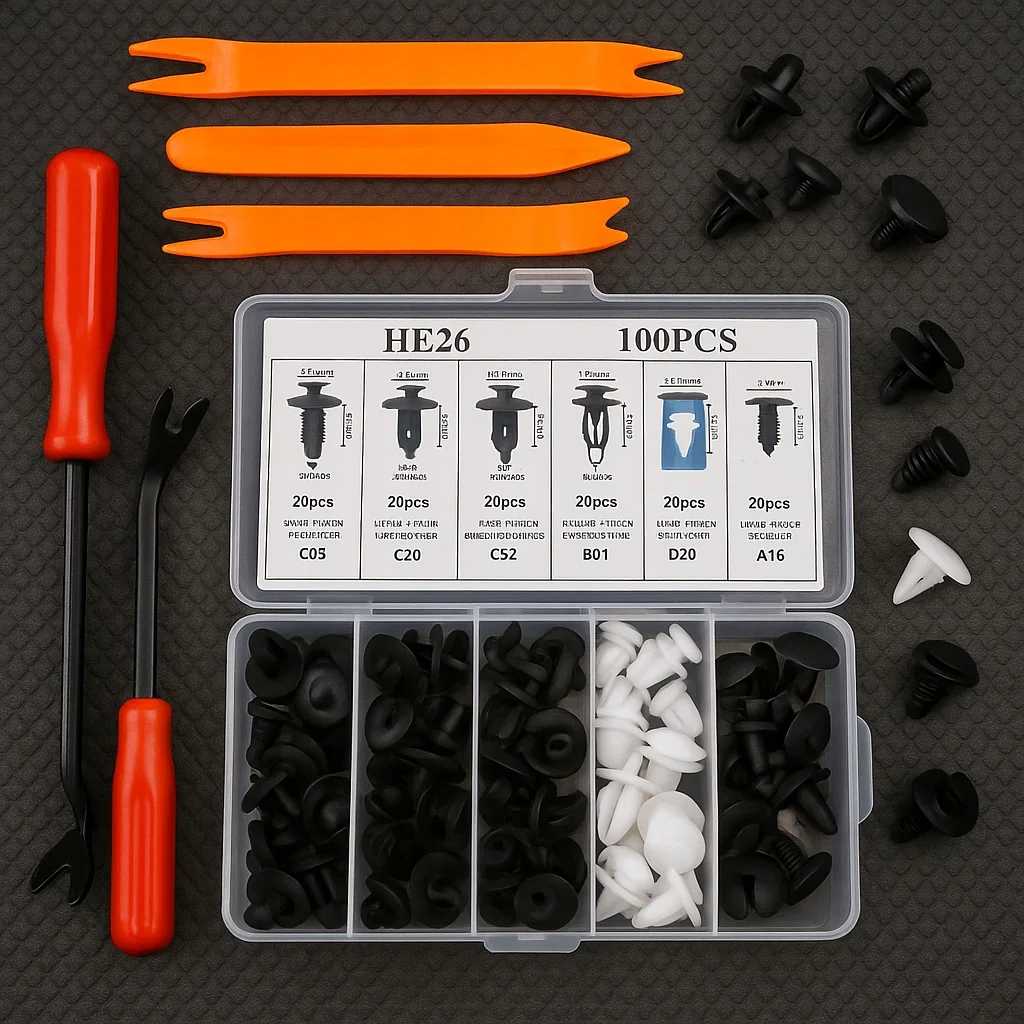 - Содержит зажимы различных размеров и типов, подходящие для многих применений (например, обивка, колесные арки, бамперы).